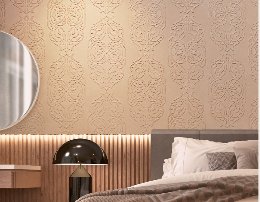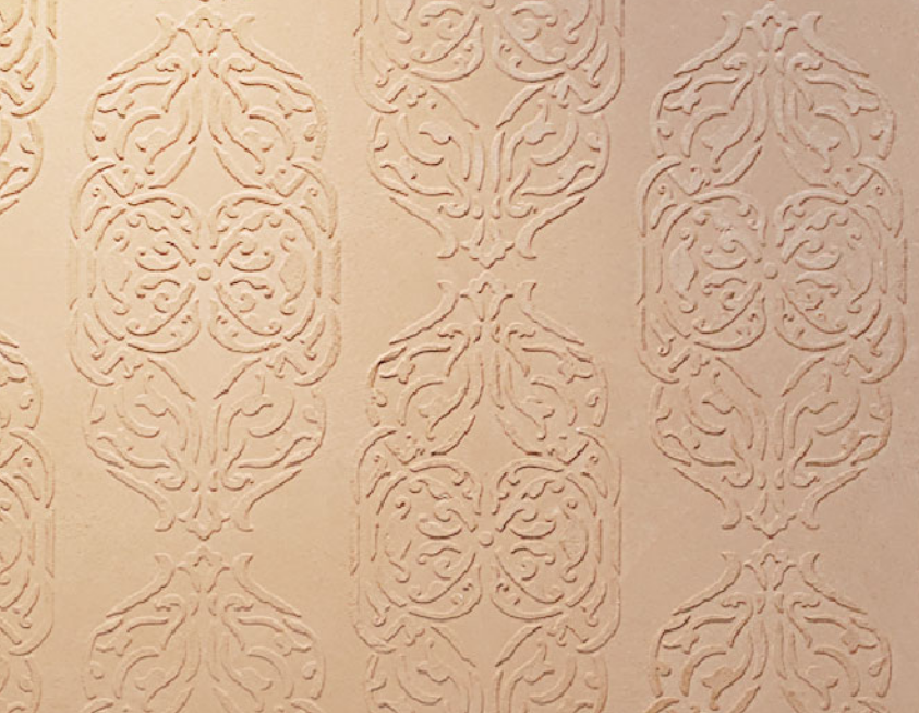 This is the classic Lithos finish, integrated with various stencils, motifs and trellises to enhance the tactility of the texture and the stencil pattern
